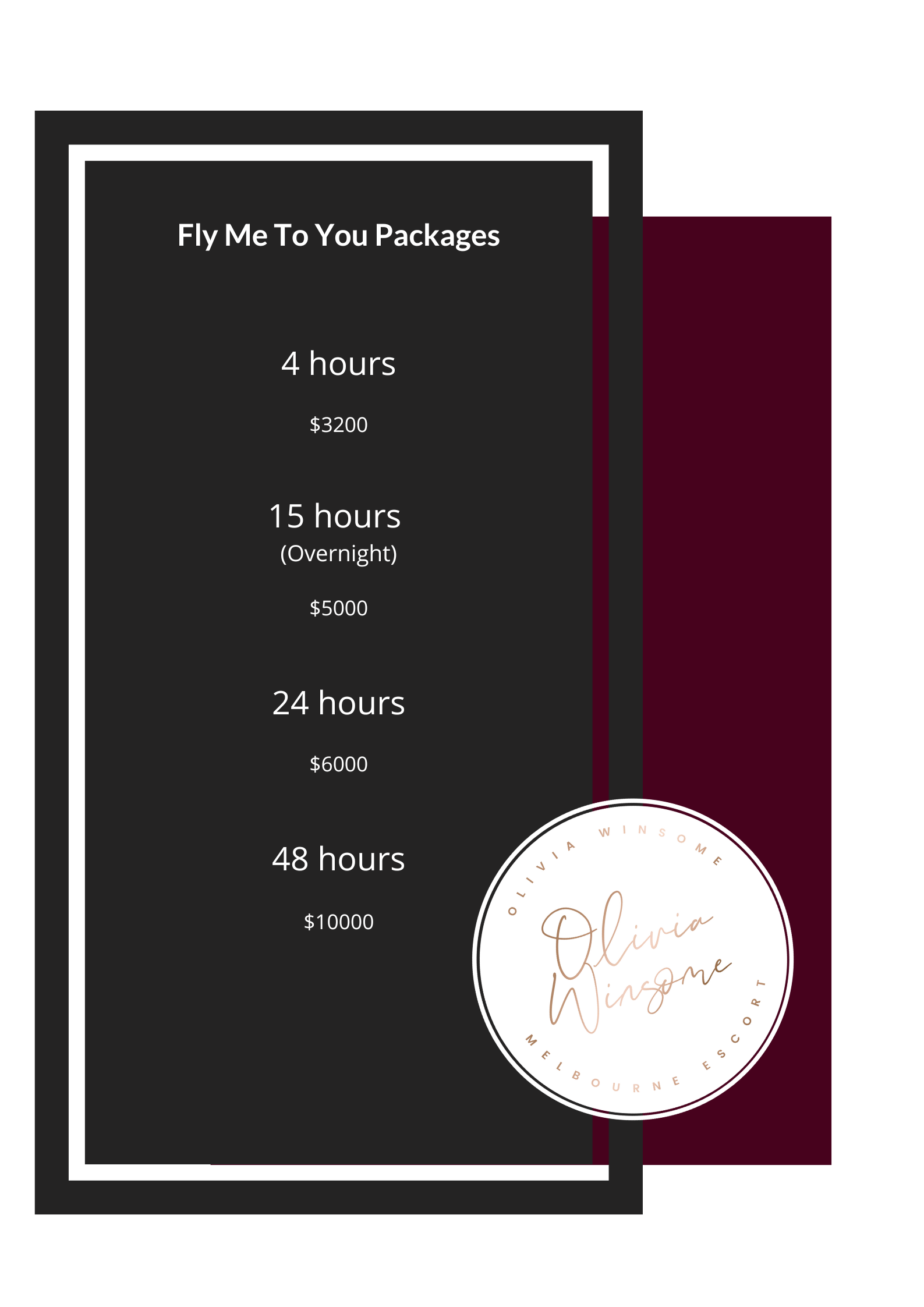 My premium escort packages are all-inclusive of my Girlfriend Experience (GFE) time, travel time and return flights in Australia. POA for international destinations.